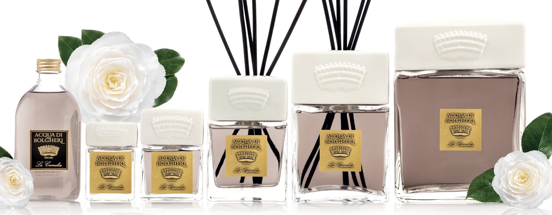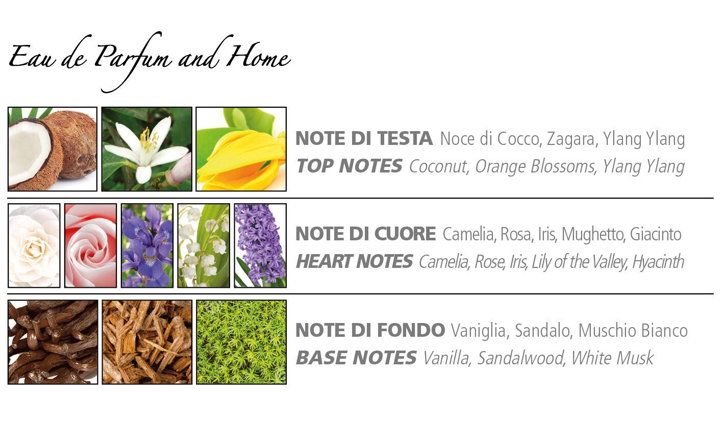La Camelia is omhullend met zijn zachte, zoete karakter. De verleidelijke zoetheid van kokosnoot en oranjebloesem smelt samen in een poederig hart van witte camelia's, iris en rozen, en eindigt in een fluweelzacht, onweerstaanbaar spoor van zoete vanille.