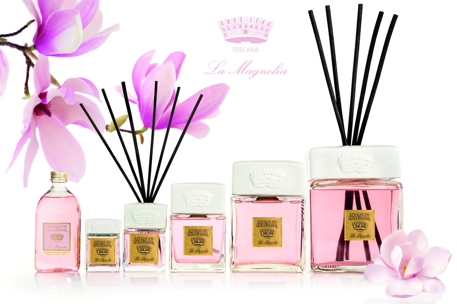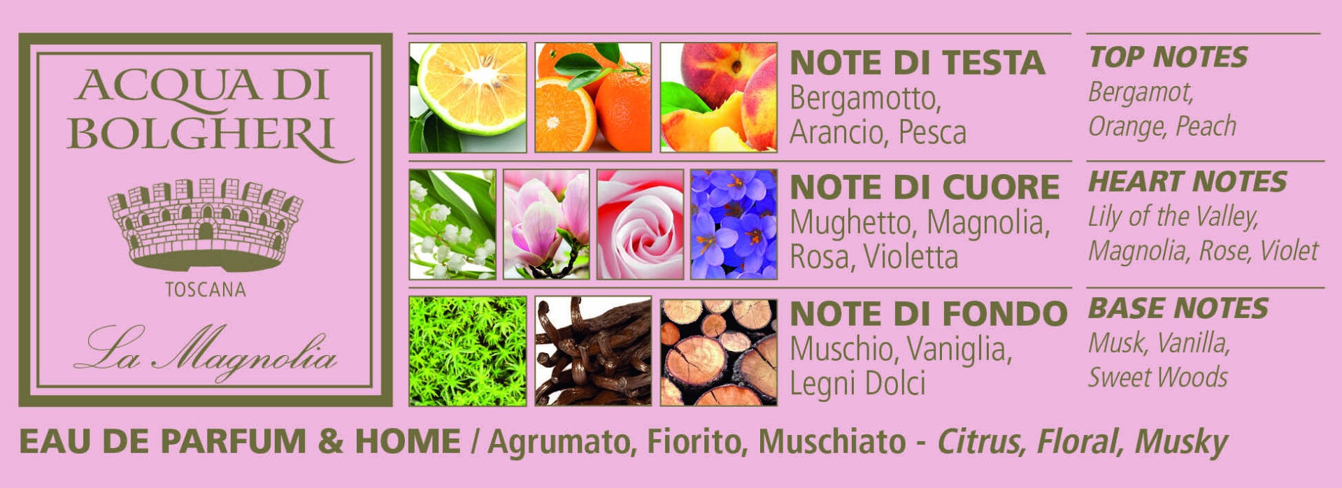 Schijnbaar fragiel, maar vol kracht: dat is Magnolia. Prachtig verweven in een boeket van rozen en lelietjes-van-dalen, met subtiele hints van perzik. Het smelt samen tot een zachte ronding van zoete tonen, een essentie met een feestelijk en vrouwelijk bloemenhart.