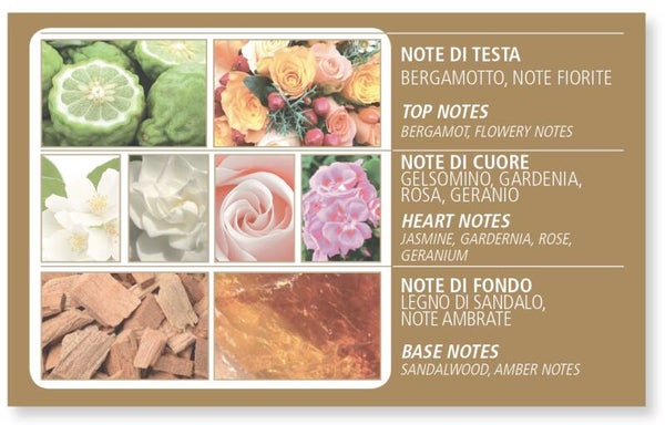 Gelsomino Toscano, een geur vol positiviteit en kracht. De betoverende, licht honingzoete tonen van jasmijn mengen zich harmonieus met de zachte zoetheid van gardenia en roos. Een warm amberakkoord in de basis zorgt voor een gevoel van geborgenheid en serene rust.