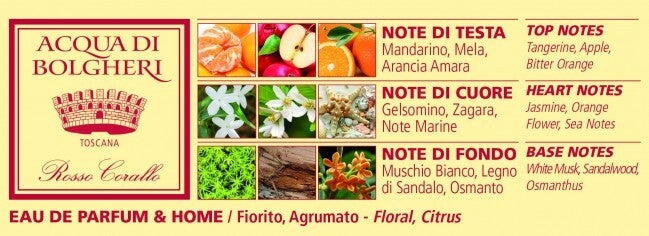 Helderrood, verfijnd en verleidelijk, dat is Rosso Corallo. Sprankelende sinaasappel en mandarijn openen de geur, met een bedwelmend hart van jasmijn, oranjebloesem en een subtiele zeebries uit Bolgheri. Diepe tonen van osmanthus onthullen zijn intrigerende karakter.